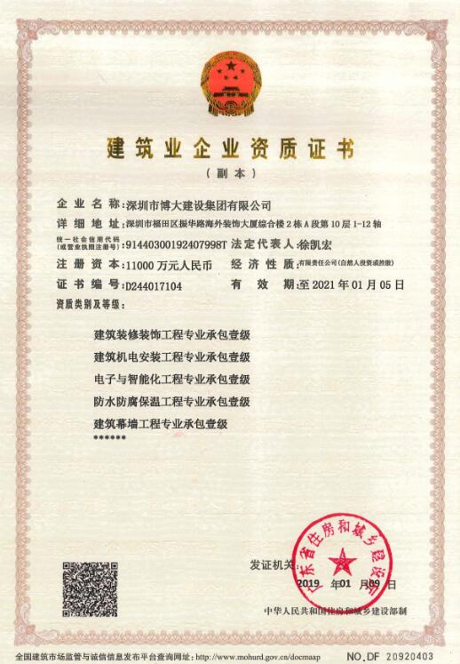 繼獲得展覽工程企業壹級、展覽陳列工程設計與施工一體化壹級、潔凈工程壹級資質之后,這是博大半年內獲得的又一個壹級資質。夢想有多高,收獲就有多大,博大平臺資質建設速度前所未有。