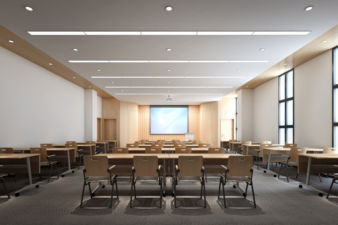 多功能教室的設計上我們將墻面和天花的木紋材質相連,通過視線引導的手法,讓學員的視線集中在講臺,地面的軟性材質,可以達到輔助吸引的效果。