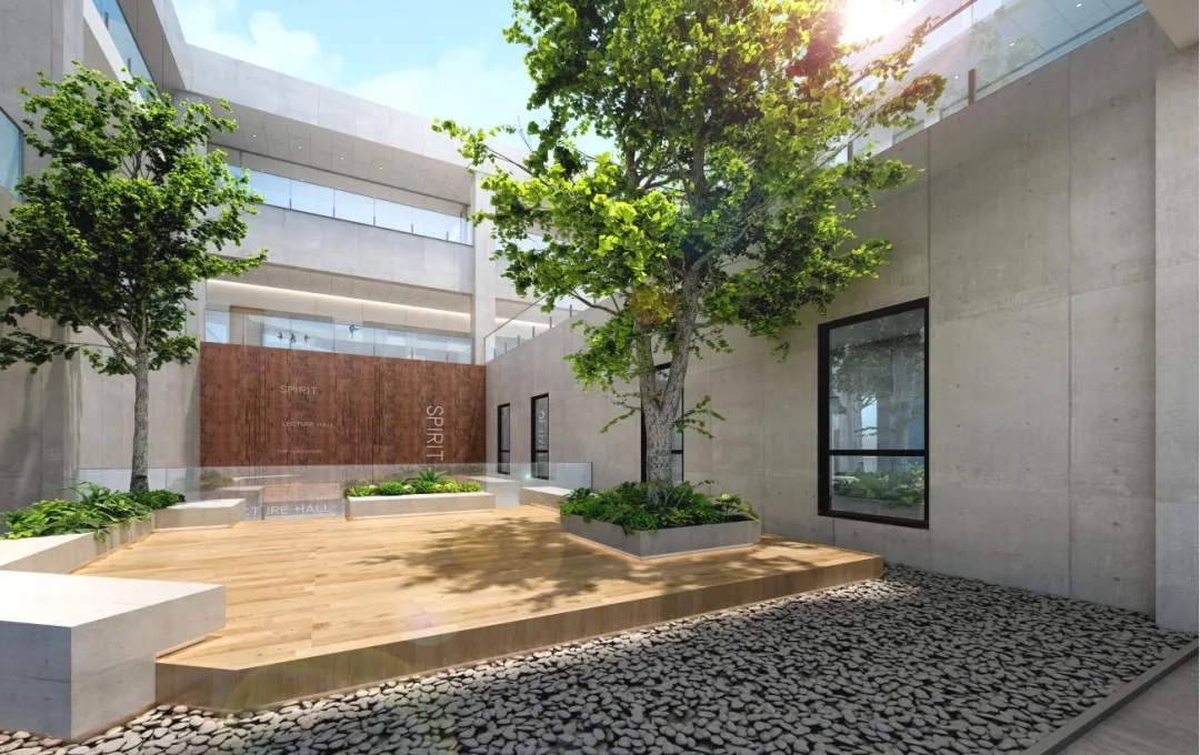 在滿是陽光的露臺上,學員可以開展一些戶外的活動,所以在布局上需要一塊相對開場的區域,周邊利用花壇結合著座椅,做一些功能性的布置。
