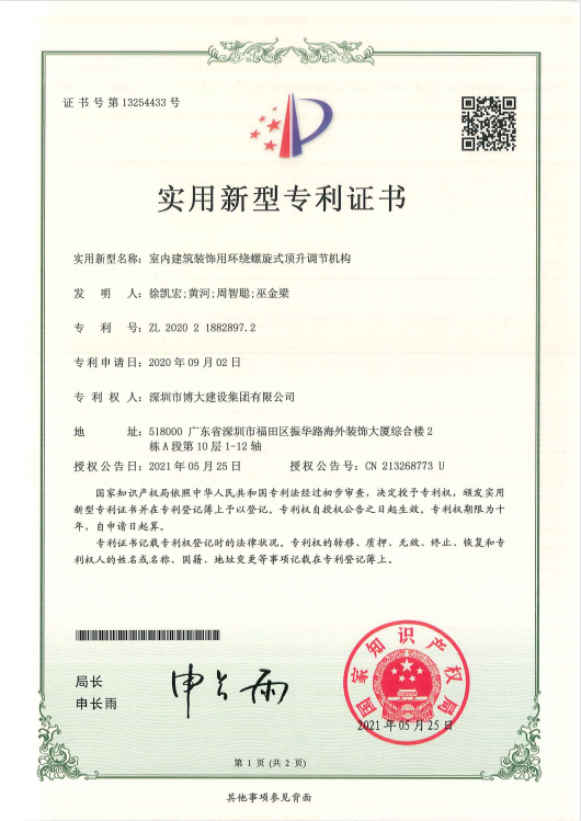 專利成果分別是《室內(nèi)建筑裝飾用環(huán)繞螺旋式頂升調(diào)節(jié)機構(gòu)》、《一種GRG吊頂安裝結(jié)構(gòu)》、《一種PC預制混凝土構(gòu)件下的特大推拉窗》、《一種帶有支撐構(gòu)件的超大空間頂轉(zhuǎn)換層結(jié)構(gòu)》、《一種單元拼接式鋁板吊頂或裝飾線條》等22項獲得由國家知識產(chǎn)權(quán)局頒發(fā)的專利證書。